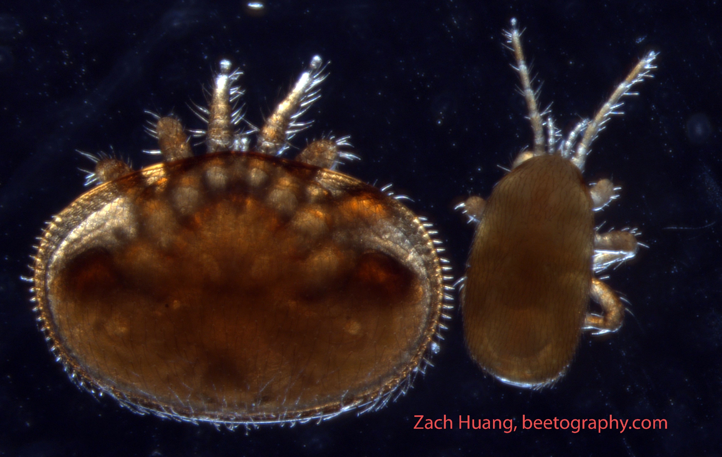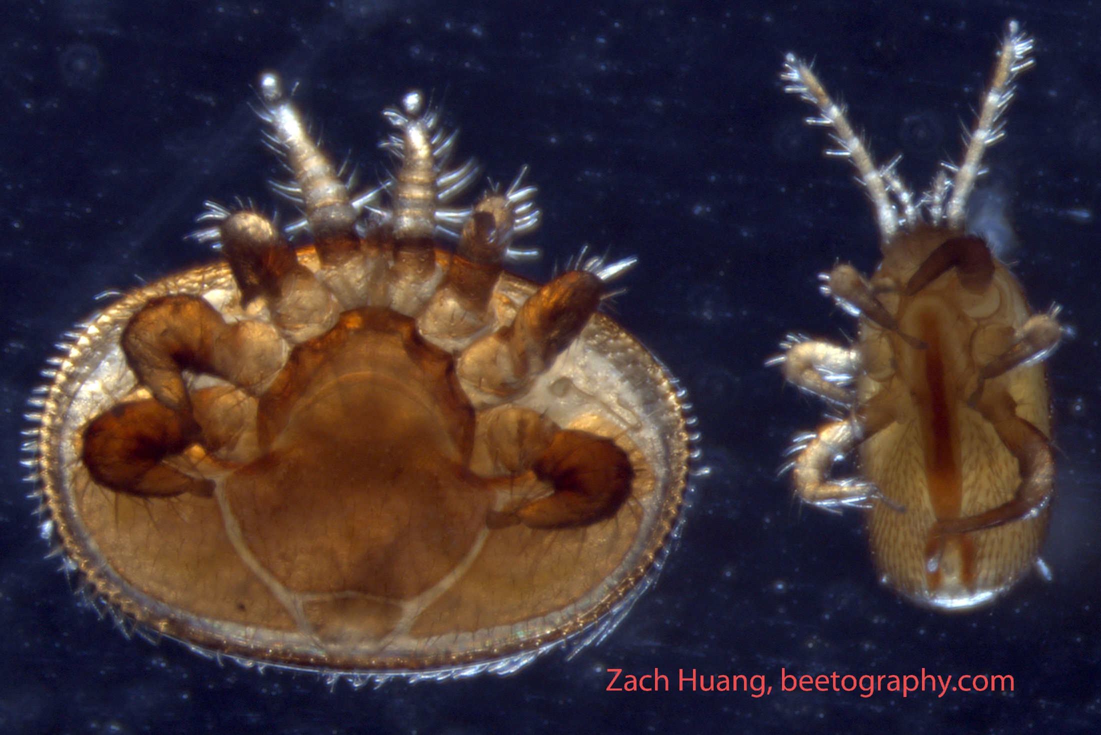 3. This is the normal position but with light coming from below. I think I did not have enough shots for the Varroa so right now it looked like upside down for the mite on left (Varroa) because you see internal structures and not the hairs on the back. But the Tropi at the right side is ok.